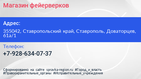 Магазин фейерверков по адресу 355042, Ставропольский край, Ставрополь, Доваторцев, 61а/1 в дальнейшем Организация, размещена в следующих категориях: