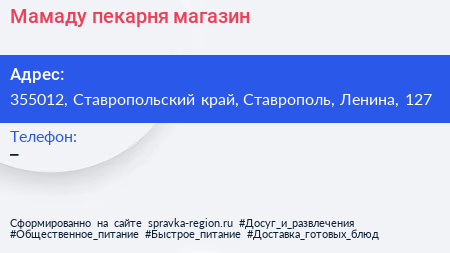 Мамаду, пекарня-магазин по адресу 355012, Ставропольский край, Ставрополь, Ленина, 127 в дальнейшем Организация, размещена в следующих категориях: