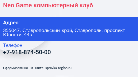 Neo Game, компьютерный клуб по адресу 355047, Ставропольский край, Ставрополь, проспект Юности, 44в в дальнейшем Организация, размещена в следующих категориях: