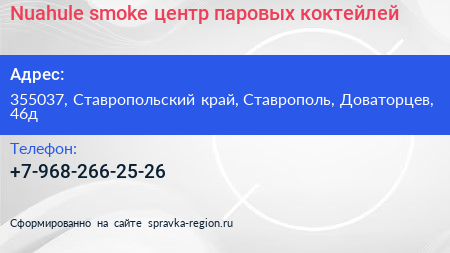 Nuahule smoke, центр паровых коктейлей по адресу 355037, Ставропольский край, Ставрополь, Доваторцев, 46д в дальнейшем Организация, размещена в следующих категориях: