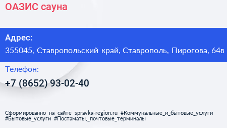 ОАЗИС, сауна по адресу 355045, Ставропольский край, Ставрополь, Пирогова, 64в в дальнейшем Организация, размещена в следующих категориях: