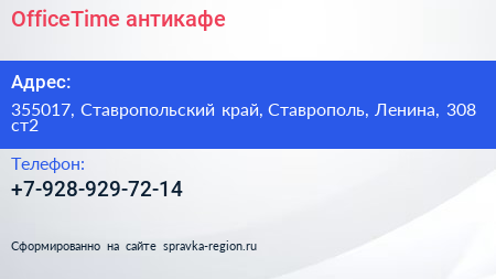 OfficeTime, антикафе по адресу 355017, Ставропольский край, Ставрополь, Ленина, 308 ст2 в дальнейшем Организация, размещена в следующих категориях: