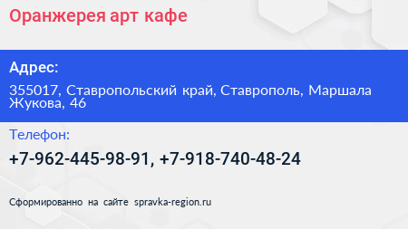 Оранжерея, арт-кафе по адресу 355017, Ставропольский край, Ставрополь, Маршала Жукова, 46 в дальнейшем Организация, размещена в следующих категориях: