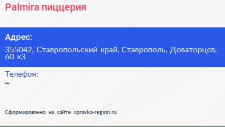 Palmira, пиццерия по адресу 355042, Ставропольский край, Ставрополь, Доваторцев, 60 к3 в дальнейшем Организация, размещена в следующих категориях: