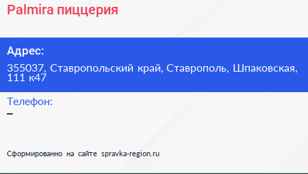 Palmira, пиццерия по адресу 355037, Ставропольский край, Ставрополь, Шпаковская, 111 к47 в дальнейшем Организация, размещена в следующих категориях: