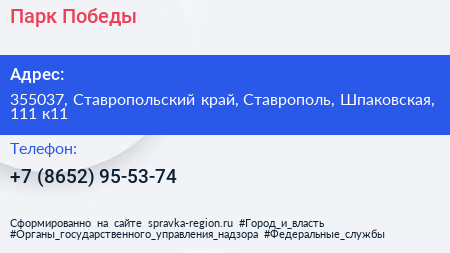 Парк Победы по адресу 355037, Ставропольский край, Ставрополь, Шпаковская, 111 к11 в дальнейшем Организация, размещена в следующих категориях: