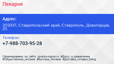 Пекарня по адресу 355037, Ставропольский край, Ставрополь, Доваторцев, 25 в дальнейшем Организация, размещена в следующих категориях: