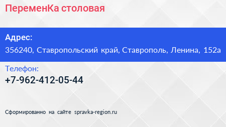 ПеременКа, столовая по адресу 356240, Ставропольский край, Ставрополь, Ленина, 152а в дальнейшем Организация, размещена в следующих категориях: