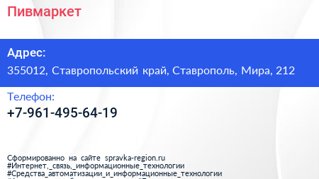 Пивмаркет по адресу 355012, Ставропольский край, Ставрополь, Мира, 212 в дальнейшем Организация, размещена в следующих категориях: