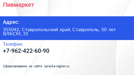 Пивмаркет по адресу 355042, Ставропольский край, Ставрополь, 50 лет ВЛКСМ, 31 в дальнейшем Организация, размещена в следующих категориях: