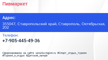 Пивмаркет по адресу 355047, Ставропольский край, Ставрополь, Октябрьская, 202 в дальнейшем Организация, размещена в следующих категориях: