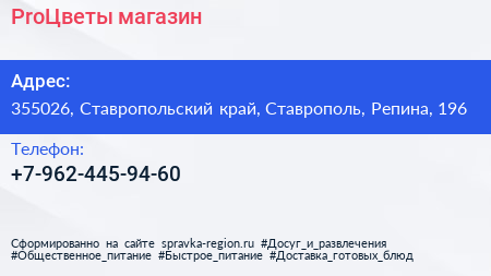 ProЦветы, магазин по адресу 355026, Ставропольский край, Ставрополь, Репина, 196 в дальнейшем Организация, размещена в следующих категориях: