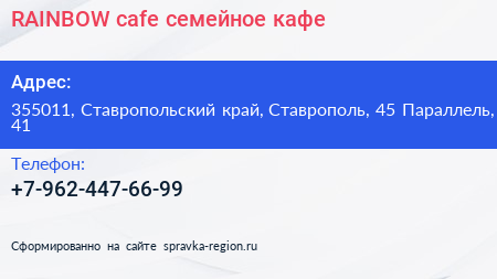 RAINBOW-cafe, семейное кафе по адресу 355011, Ставропольский край, Ставрополь, 45 Параллель, 41 в дальнейшем Организация, размещена в следующих категориях: