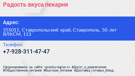 Радость вкуса, пекарня по адресу 355011, Ставропольский край, Ставрополь, 50 лет ВЛКСМ, 113 в дальнейшем Организация, размещена в следующих категориях:
