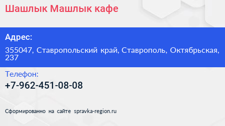Шашлык-Машлык, кафе по адресу 355047, Ставропольский край, Ставрополь, Октябрьская, 237 в дальнейшем Организация, размещена в следующих категориях: