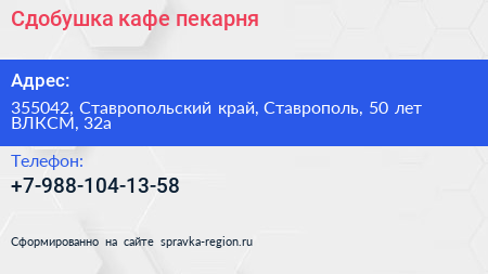 Сдобушка, кафе-пекарня по адресу 355042, Ставропольский край, Ставрополь, 50 лет ВЛКСМ, 32а в дальнейшем Организация, размещена в следующих категориях: