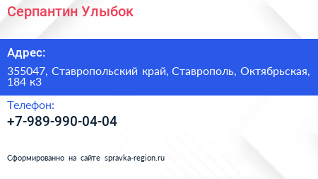 Серпантин Улыбок по адресу 355047, Ставропольский край, Ставрополь, Октябрьская, 184 к3 в дальнейшем Организация, размещена в следующих категориях: