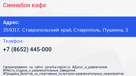 Синнабон, кафе по адресу 355017, Ставропольский край, Ставрополь, Пушкина, 3 в дальнейшем Организация, размещена в следующих категориях: