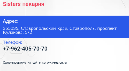 Sisters, пекарня по адресу 355035, Ставропольский край, Ставрополь, проспект Кулакова, 5/2 в дальнейшем Организация, размещена в следующих категориях: