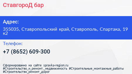 СтавгороД, бар по адресу 355035, Ставропольский край, Ставрополь, Спартака, 19 к2 в дальнейшем Организация, размещена в следующих категориях: