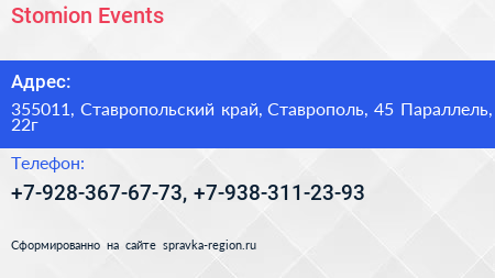 Stomion Events по адресу 355011, Ставропольский край, Ставрополь, 45 Параллель, 22г в дальнейшем Организация, размещена в следующих категориях:
