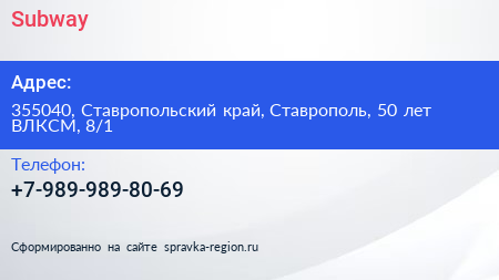 Subway по адресу 355040, Ставропольский край, Ставрополь, 50 лет ВЛКСМ, 8/1 в дальнейшем Организация, размещена в следующих категориях: