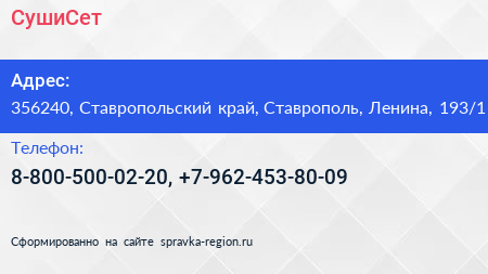 СушиСет по адресу 356240, Ставропольский край, Ставрополь, Ленина, 193/1 в дальнейшем Организация, размещена в следующих категориях: