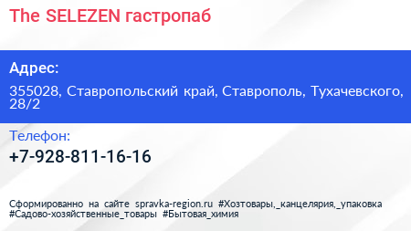 The SELEZEN, гастропаб по адресу 355028, Ставропольский край, Ставрополь, Тухачевского, 28/2 в дальнейшем Организация, размещена в следующих категориях: