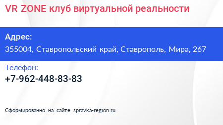 VR-ZONE, клуб виртуальной реальности по адресу 355004, Ставропольский край, Ставрополь, Мира, 267 в дальнейшем Организация, размещена в следующих категориях: