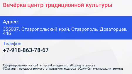Вечёрка, центр традиционной культуры по адресу 355037, Ставропольский край, Ставрополь, Доваторцев, 44Б в дальнейшем Организация, размещена в следующих категориях: