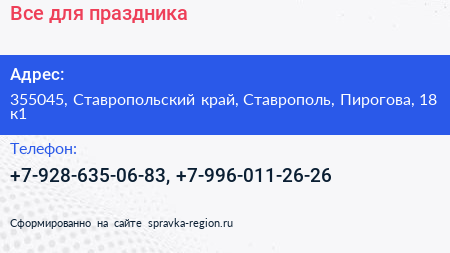 Все для праздника по адресу 355045, Ставропольский край, Ставрополь, Пирогова, 18 к1 в дальнейшем Организация, размещена в следующих категориях: