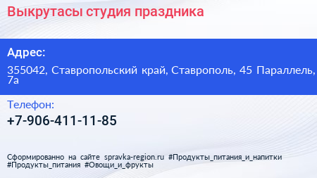 Выкрутасы, студия праздника по адресу 355042, Ставропольский край, Ставрополь, 45 Параллель, 7а в дальнейшем Организация, размещена в следующих категориях: