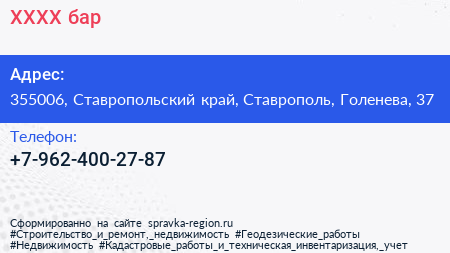 XXXX, бар по адресу 355006, Ставропольский край, Ставрополь, Голенева, 37 в дальнейшем Организация, размещена в следующих категориях:
