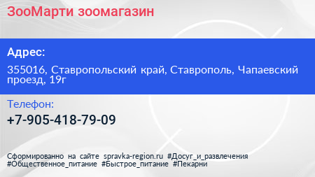 ЗооМарти, зоомагазин по адресу 355016, Ставропольский край, Ставрополь, Чапаевский проезд, 19г в дальнейшем Организация, размещена в следующих категориях: