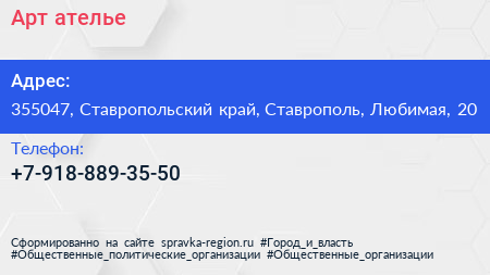 Арт-ателье по адресу 355047, Ставропольский край, Ставрополь, Любимая, 20 в дальнейшем Организация, размещена в следующих категориях: