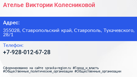 Ателье Виктории Колесниковой по адресу 355028, Ставропольский край, Ставрополь, Тухачевского, 28/1 в дальнейшем Организация, размещена в следующих категориях: