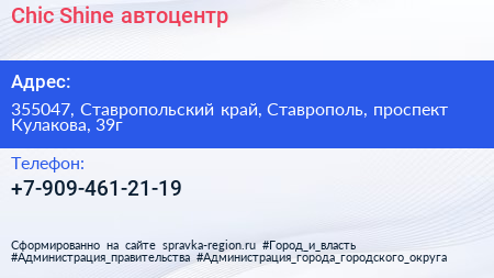 Chic & Shine, автоцентр по адресу 355047, Ставропольский край, Ставрополь, проспект Кулакова, 39г в дальнейшем Организация, размещена в следующих категориях: