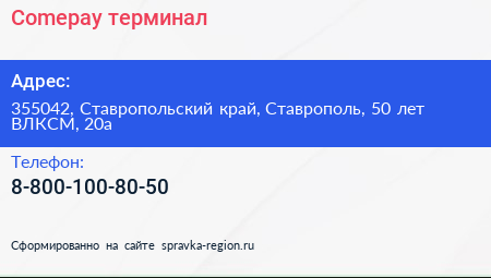 Comepay, терминал по адресу 355042, Ставропольский край, Ставрополь, 50 лет ВЛКСМ, 20а в дальнейшем Организация, размещена в следующих категориях:
