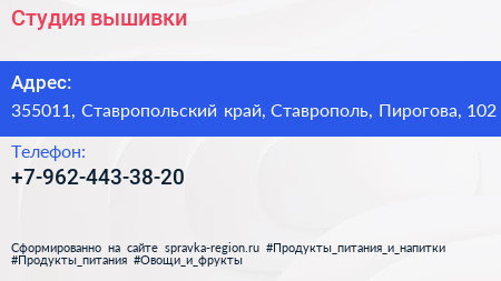 Cтудия вышивки по адресу 355011, Ставропольский край, Ставрополь, Пирогова, 102 в дальнейшем Организация, размещена в следующих категориях: