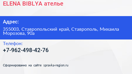 ELENA BIBLYA, ателье по адресу 355003, Ставропольский край, Ставрополь, Михаила Морозова, 90а в дальнейшем Организация, размещена в следующих категориях: