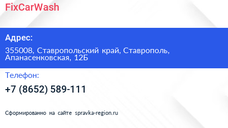 FixCarWash по адресу 355008, Ставропольский край, Ставрополь, Апанасенковская, 12Б в дальнейшем Организация, размещена в следующих категориях: