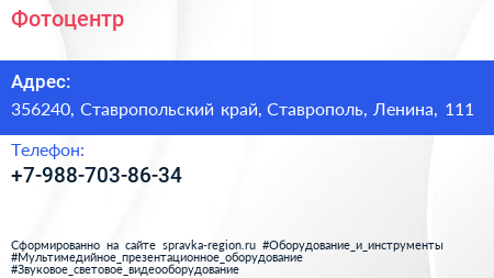 Фотоцентр по адресу 356240, Ставропольский край, Ставрополь, Ленина, 111 в дальнейшем Организация, размещена в следующих категориях: