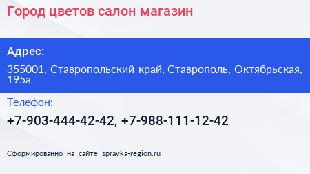Город цветов, салон-магазин по адресу 355001, Ставропольский край, Ставрополь, Октябрьская, 195а в дальнейшем Организация, размещена в следующих категориях: