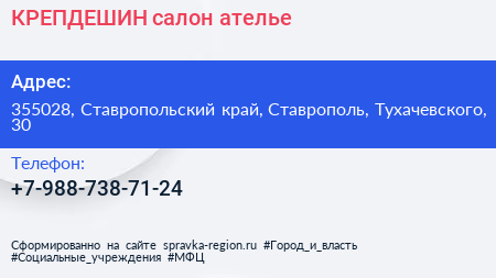 КРЕПДЕШИН, салон-ателье по адресу 355028, Ставропольский край, Ставрополь, Тухачевского, 30 в дальнейшем Организация, размещена в следующих категориях: