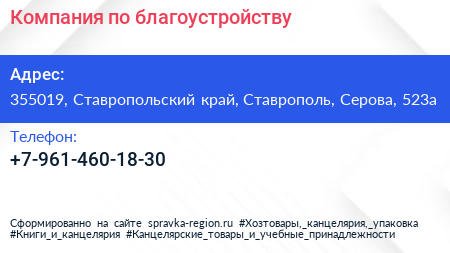 Компания по благоустройству по адресу 355019, Ставропольский край, Ставрополь, Серова, 523а в дальнейшем Организация, размещена в следующих категориях:
