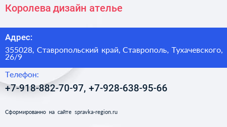 Королева, дизайн-ателье по адресу 355028, Ставропольский край, Ставрополь, Тухачевского, 26/9 в дальнейшем Организация, размещена в следующих категориях: