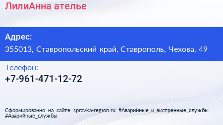 ЛилиАнна, ателье по адресу 355013, Ставропольский край, Ставрополь, Чехова, 49 в дальнейшем Организация, размещена в следующих категориях: