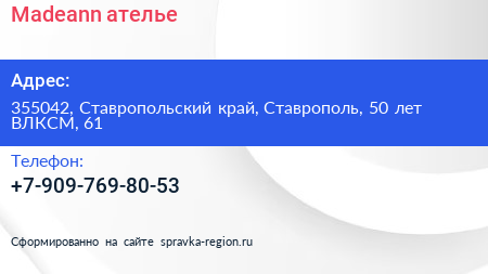 Madeann, ателье по адресу 355042, Ставропольский край, Ставрополь, 50 лет ВЛКСМ, 61 в дальнейшем Организация, размещена в следующих категориях: