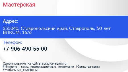 Мастерская по адресу 355040, Ставропольский край, Ставрополь, 50 лет ВЛКСМ, 16/6 в дальнейшем Организация, размещена в следующих категориях: