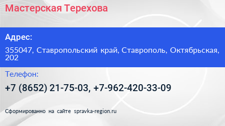 Мастерская Терехова по адресу 355047, Ставропольский край, Ставрополь, Октябрьская, 202 в дальнейшем Организация, размещена в следующих категориях:
